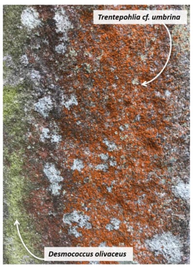 The species Trentepohlia cf. umbrina, Desmococcus olivaceus, Stichococcus bacillaris, and Klebsormidium cf. flaccidum were previously found to be the most representative dominant species on the exterior granite walls of the Galician Monumental Built Heritage, with Trentepohlia spp. characteristically found on N-facing walls [,], as in the SMV and BAR churches.