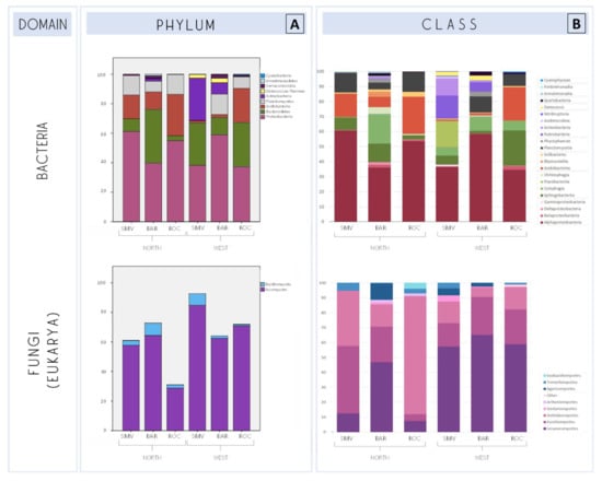 Microbial community composition (of both bacteria and fungi) of the samples collected from both N- and W-facing walls of the SMV, BAR and ROC churches is represented in Figure 5A (at the phylum level) and Figure 5B (at the class level). The biofilms sampled include a large diversity of species, particularly in the bacterial domain, but also with a strong presence of lichenized fungi. The main species present are shown in Table 2. The value of sampling rural churches to analyze the biodiversity of granite colonizing organisms was previously reported [,] and the substrate aspect, inclination, wetness, exposure to rain, degree of disaggregation of the rock, and proximity to mortar were indicated as important factors in determining the composition of the flora.
