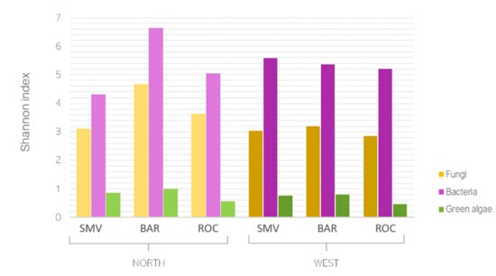 Thus, taking into consideration the organisms found on the three churches, although the total microbial diversity did not depend on the different locations, it did depend on the orientation of the walls and was highest on the N-facing walls. The values of the Shannon index (Figure 6) indicated that diversity was generally highest among the bacteria, followed by the fungi and green algae. However, regarding Bacteria diversity, no significant differences were found between locations or orientations (p > 0.05). In the case of fungi and green algae, a greater diversity of these organisms was found on the N-facing walls (p < 0.05). However, the low diversity observed in the green algae group may be due to the use of the culture-dependent technique, which generally reduces the variability detected []. In terms of abundance, the orders of bacteria found in highest proportion were the Sphingomonadales and the Acidobacteriales. Most of the fungi present in the microbial consortium are lichenized fungi belonging to the order Lecanorales, although non-lichenized fungi from Capnoidales and Chaetothyriales orders are also present in large proportion. Lichenized fungi were distributed differently in relation to orientation, and they were more abundant on the W-facing walls. In the case of green algae, one of the two most abundant species, Trentepohlia cf. umbrina, mainly occurred on N-facing walls, while the other, Desmococcus olivaceus, was found on W-facing walls. Moreover, diatoms were only present in the microbial consortium on the N-facing wall of the BAR church, which confirms the damper conditions on this wall.