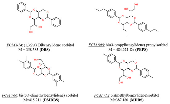 The following are available online at https://www.mdpi.com/article/10.3390/app11093789/s1, Figure S1: HR-QTOF MS of dibenzylidene sorbitol (DBS; FCM 674), Figure S2: HR-QTOF MS of bis(methylbenzylidene)sorbitol (DMBS; FCM 752), Figure S3: HR-QTOF MS of bis(4-propylbenzylidene) propyl sorbitol (PBPS; FCM 808), Figure S4: HR-QTOF MS of bis(3,4-dimethylbenzylidene) sorbitol (DMBS; FCM 766).