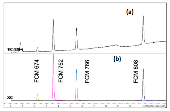 UHPLC-QTOF MS TIC (a) and XIC (b) of the studied target sorbitol-based nucleating agents (100 μg L−1).