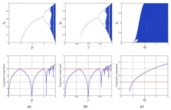 where  and  are the systems’ parameters. As shown in Figure 1b, the Sine map shares similar chaotic behaviors with the Logistic map. As shown in Figure 1c,  fills in the range , and the Lyapunov exponent increases monotonically with . The Chebyshev map starts to enter the chaotic regime when .