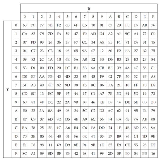 S-box of AES. The substitution value is determined by the intersection of the row with index ‘x’ and the column with index ‘y’.