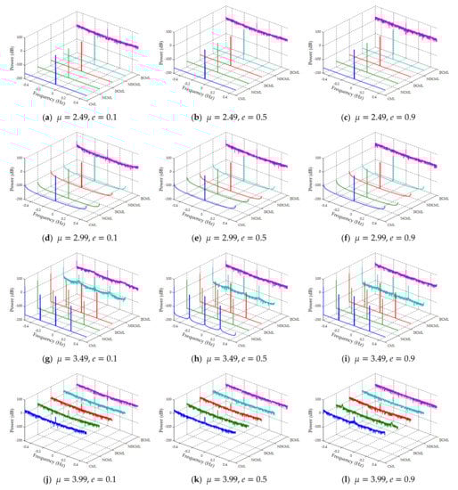 By comparison, we find that the parameter e has a relatively small influence on the power spectrum. Thus, the following discussion mainly focuses on the effect of different values of . As we see, for the baseline systems, almost all the power is concentrated at zero-frequency component when  or 2.99. This means that there is almost no fluctuation in the corresponding sequence, so that it belongs to a direct-current signal. When , the baseline systems distribute the power onto several frequency components. This implies that the corresponding sequence contains periodic transitions between several state variables, so that it belongs to a deterministic signal. When , five power spectrums share the similar noise-like modality, meaning that all the systems have turned into the complete turbulence pattern []. Remarkably, even when , 2.99, or 3.49, the IJCML system’s power is evenly dispersed over all frequency components, in the sense that there exists only one small peak submerged in the noise-like fluctuations. This phenomenon demonstrates that the proposed system behaves better than the baseline ones, and indeed enlarges the parameter space of spatiotemporal chaos.