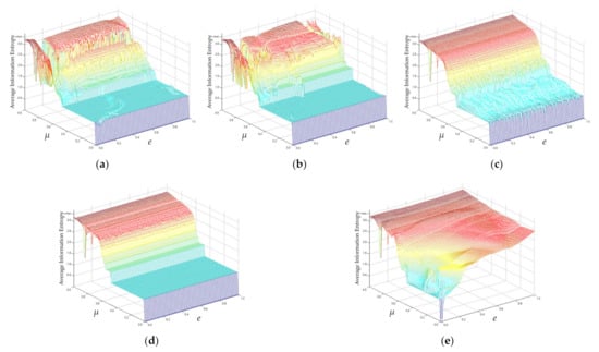 We see that, for the baseline systems, the average values of H(c) form a stair-stepped upward trend as  increases, and the two notable steps appear at  and 3.48, respectively. When , the DCML system has a smooth surface, in which the average values are independent of e. For the NDCML system, two straight ravines that appear at  and 3.84, respectively, go through the surface. This phenomenon is consistent with the observation in Section 3.3, demonstrating that there still exist defects in the NDCML system even when  is set to a higher value. For the CML system, a L-shaped valley with larger area is embedded into the surface. This analysis provides a warning that one should carefully select the parameters before using a CML-based image cryptosystem. Equipped with the non-adjacent coupling mechanism, the NCML system reduces the area of the valley, but fails to construct a smooth surface. For the IJCML system, the average value of H(c) increases along the axes of  and e, and the leaf-like surface covers a larger parameter space of spatiotemporal chaos. These results verify that the IJCML system is superior to the baseline ones in terms of information entropy.