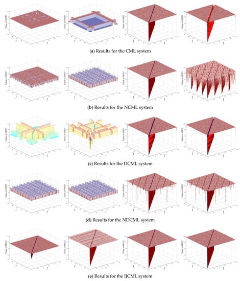 When , the values of MIED constitute a plateau lying close to MAX. The groove along the principal diagonal corresponds to the self-independence of a specific lattice, namely , where . Clearly, a flat plateau with a narrow groove indicates good performance of the inter-lattice independence. For the CML system, increasing e reinforces the interactions between two lattices, and thus results in a wider groove and four sunken regions around the corners. A similar phenomenon also happens in the DCML system, implying that a dynamical coupling coefficient is insufficient to eliminate the coupling-caused correlations. For the NCML and NDCML systems, there exist multiple diagonal grooves embedded into the flat plateau due to the use of Arnold cat map. From the first two columns of Figure 7e, we find that the IJCML system can reach higher value of MIED when  and . More significantly, the IJCML system forms the flattest plateau with a unit-width groove when . These comparisons demonstrate that the IJCML system has a larger parameter space for generating the independent sequences randomly.