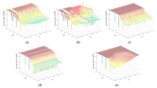 When , the values of MIED, in general, form a middle-level plane containing fluctuations of various patterns. Interestingly, for the NCML system, the punctate leakages are expanded to box-like pits as e increases. This is because a greater coupling coefficient usually enhances the correlations between a pair of lattices i and j, thereby yielding a higher value of . Moreover, as shown in the second column of Figure 7b, the box-like pits are arranged with a regular period. This arises from the fact that the Arnold cat map, which is used in the NCML system, forces some pairs of lattices to interact with each other repeatedly during the iterative procedure. Unfortunately, this defect is inherited by the NDCML system, as shown in Figure 7d.