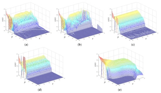 Resulting values of KSED for the Lyapunov exponent analysis. (a) Result for the CML system. (b) Result for the NCML system. (c) Result for the DCML system. (d) Result for the NDCML system. (e) Result for the proposed IJCML system.