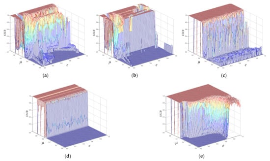 Resulting values of KSEB for the Lyapunov exponent analysis. (a) Result for the CML system. (b) Result for the NCML system. (c) Result for the DCML system. (d) Result for the NDCML system. (e) Result for the proposed IJCML system.