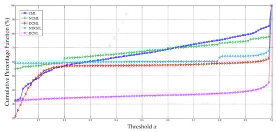 Further, we design a statistical tool called Cumulative Percentage Function (CPF) for analyzing KSEB. The CPF is to reflect the percentage of parameter pairs {, e} making KSEB less than or equal to a specific threshold . We show the plots of CPFs in Figure 11. The ideally optimal case is that all possible combinations of  and e can lead a system into the fully chaotic regime, where all its lattices have the chaotic behaviors, namely . Obviously, the ideally optimal case corresponds to an impulse function centered at 1.0. Among all CPFs, the pink one is closest to the impulse function, consisting of a wide flat region and a narrow step region. The higher the step occurs at  in Figure 11, the larger the area of flat plateau in Figure 10. Based on above observations, we state that the proposed IJCML system is better than the baseline ones in terms of the Lyapunov exponent analysis.