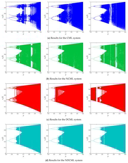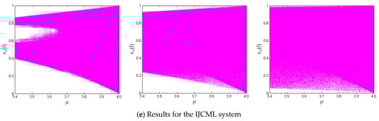 For the baseline systems, we can clearly observe that period-doubling bifurcations form a route to spatiotemporal chaos. For example, the NDCML system gets trapped in period-two oscillations when . Two bifurcation points at  double the periods of the orbits and give rise to pitchfork bifurcations. This process is repeated as  increases. Starting from , it is virtually impossible to observe the pitchfork bifurcations because the number of bifurcation points becomes large and the gaps between the bifurcation points are negligible. Unfortunately, the chaotic oscillations of the baseline systems may occasionally be interspersed with periodic windows in some cases. For example, when setting  to 3.63, we can observe the periodic windows in the NDCML system, where the oscillations suddenly degenerate into several periods. Comparing the baseline systems’ bifurcation diagrams, we find that they roughly share the same phenomenon. That is, the period-doubling bifurcations trigger chaotic oscillations interspersed with periodic windows. By contract, the proposed IJCML system has a large number of bifurcation points with tiny gaps between them even when . This demonstrates that the IJCML system enters the chaotic regime early. Additionally, the IJCML system greatly reduces the periodic windows compared with the baseline ones. As shown in Figure 12e, a higher coupling coefficient introduces more pseudo-random motions from the multiple chaotic maps, so as to further enhance the chaotic oscillations. Based on these comparisons, we claim that the IJCML system behaves better than the baseline ones in terms of the bifurcation diagram analysis.