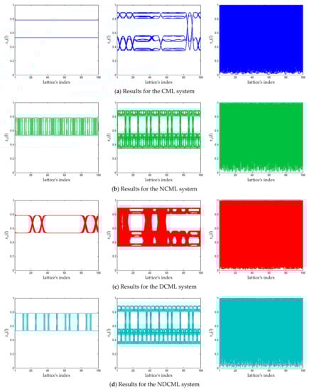 The bifurcation diagram, which is a plot of the state variables versus the control parameter(s), is commonly used to analyze a dynamical system. Let all the systems, in this simulation study, work under the setting  and . In Figure 12, we depict the bifurcation diagrams, in which the state variables are harvested from the 1st, 50th, and 100th lattices. For convenient comparison, the bifurcation diagrams belonging to different systems are coated with different colors.