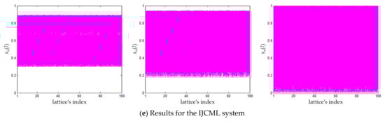 In this section, we analyze the chaotic behaviors of the IJCML system from nine aspects, and make comparisons with the baseline systems, including CML [], NCML [], DCML [], and NDCML []. Throughout our analysis, the number of lattices L is set to 100, while the maximum number of iterations, namely N, equals 1000. Unless explicitly stated, the auxiliary parameters, including s, t, , are set to 23, 12, 3.99, respectively.