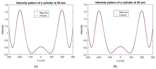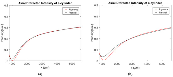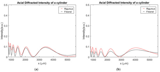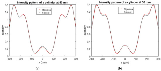 Figure 5 and Figure 6 show the comparison of both theories for a circular cylinder. The intensity pattern was calculated at a screen that was positioned at an axial distance that was varied in the simulations. The wavelength of the incident light was chosen to be 633 nm, while the radius of the cylinder was considered as 30 µm in the case of Figure 5 and 80 µm in the case of Figure 6. It can be observed that the behavior of both curves, one obtained by using the Fresnel approximation and the other by using the rigorous solution, behaved in the same manner as a function of the axial distance. Both models gave basically the same results, but it was clear that the higher the distance to the screen, the better the agreement between both models. This is due to the fact that the Fresnel approximation works better for lower values of the Fresnel number (NF) [8], which is defined as: