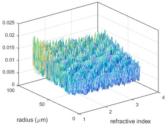 This is also clear from Figure 9, where the relative error of the Fresnel method with respect to the rigorous one is depicted for a range of values for the refractive index from 1.3 to 4 and values of the radius of the cylinder from 30 to 90 µm. In order to calculate the error, the solution given by the Fresnel method and the rigorous one were calculated at each pair of values (a,n). The error was calculated at the target plane for every tested (a,n) pair using the L2-norm of the error under constant illumination. This error was divided with respect to the intensity obtained by the rigorous method integrated at the target plane. From the figure, two conclusions can be obtained: on the one hand the error in the range of values evaluated mainly increased with the radius of the cylinder; on the other hand, it can be seen that small differences existed between the two methods.