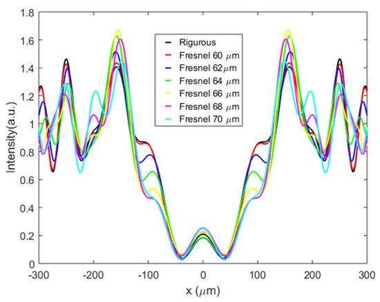 Figure 10 shows the intensity profile at a distance of 20 mm from the cylinder. The rigorous solution was calculated for a refractive index of n = 1.5 and a = 60 µm, and the Fresnel method was performed for thickness values of 60, 62, 64, 66, 68, and 70 µm. From the figure, it is clear that variations of 2 µm in the radius created visible changes in the shape of the curves obtained using the Fresnel method. The distance from the maximum value to the minimum value of the curve also changed with an increase or decrease of 2 µm in the radius of the cylinder.