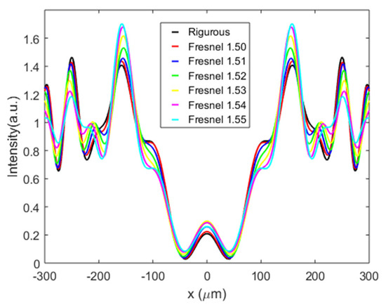 Figure 11 shows also the intensity profile at a distance of 20 mm from the cylinder, but in this case the modified parameter was the refractive index. The rigorous solution was calculated for a refractive index of n = 1.5 and a = 60 µm, and the Fresnel method was performed for values of the refractive index of 1.50, 1.51, 1.52, 1.53, 1.54, and 1.55. As in Figure 10, variations of 0.01 created visible changes in the shape of the curves and also in the difference between the maximum and minimum value of the curve. On the other hand, it is interesting to note that small changes in the radius provoked different, although subtle, variations in the theoretical curve than in the case of changing the refractive index. For instance, if one looks the behavior of the curves in the range of x: (−130, −70) µm, or symmetrically in the range of x: (70, 130) µm, one can see that in the transformation of the curve at starting values (red curve) to that of the final values (light blue curve), those transforming through changes in the radius possessed a local maximum and a local minimum, whereas those transforming through changes in the refractive index did not.
