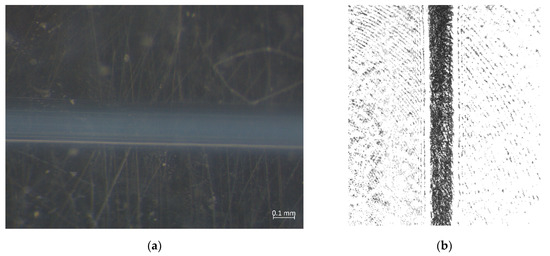 Finally, in order to demonstrate the potential of the method, this was applied to obtain the dimensions of a crack artificially created in a piece of plastic. Figure 15 shows an image obtained from an optical microscope of the piece of plastic and the crack artificially created (a), and the diffraction pattern observed (b). Figure 16 shows the experimental data (extracted from the diffraction pattern) and a theoretical fit made by using the method described in Section 2.1. In this case, Equations (2) and (3) were changed to account for an elliptical crack with refractive index 1 (air), and the refractive index of the surroundings was set to 1.51 (refractive index of plastic). The varying parameter in this case was the width of the crack. As in the case of the hair, we used the “lsqcurvefit” function of MATLAB with an initial guess of 100 µm. The width of the crack obtained with the aid of the microscope was 175 ± 5 µm, whereas the fit gave a value of 172 µm.