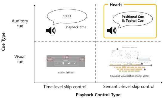 We classified the awareness cue into two modality types: (1) visual cue and (2) auditory cue. There are many graphical user interfaces for audio playback. The most common one is an audio seekbar. It can help users monitor the current playback and easily move to the targeted position using its slider bar. In addition, there have been graphical interfaces for visualizing keywords in audio []. Most of the studies in this design subspace utilize texts corresponding to the audio content.