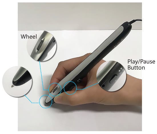 Figure 2 represents the prototype of HearIt. HearIt has a pen shape to reduce the interface’s complexity for audio controls by utilizing intuitive gestures instead of more buttons. HearIt has a play/pause button and a scroll wheel for the playback control. In addition, its pen point is used to recognize gestures of drawing lines. HearIt is designed to support key components of information browsing behavior []: (1) linking and chaining and (2) extraction and evaluation. First, HearIt provides paragraph-level skip control to facilitate efficient chaining and linking by enabling the user to skip forward or backward in semantic chunks. In addition, it provides auditory cues that enable the user to extract and evaluate the information based on a quick understanding of its positional and topical context.