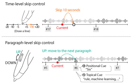 Nowadays, audio contents contain various helpful information. For example, in many classrooms, students record lectures and use them for their active learning. Especially, such audio recording and re-playing are essential for visually-impaired people. Many people with visual impairment benefit from auditory guidance for their daily activities such as studying [], filling out a form [], taking a pictures [,]. There have been many studies to support information access of visually-impaired people. Some studies have proposed tools that enable users to process information by converting written texts to spoken text. For example, screen readers provide an audio-based interface to navigate a screen [,,]. FingerReader [] reads aloud printed-texts to help blind users aware of the information.