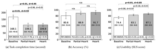 We note that the number of participants in our pilot study still satisfied the minimum requirement for the statistical test. G*Power (http://www.gpower.hhu.de/, accessed on 10 September 2020), a power analysis application, revealed that a sample size of 12 is enough to provide statistical significance with 80% power () for large effect size () and with an alpha level set at 0.05. In addition, the earlier HCI studies [,] used 12 participants to perform a within-subject (repeated measure) experiment to evaluate the task performance with the apparatus.