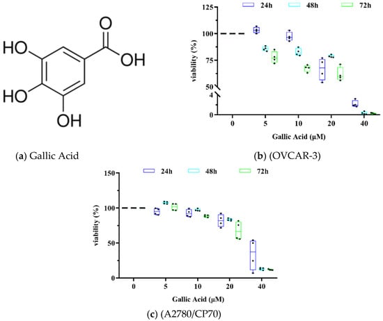 - Varela-Rodríguez, L.; Sánchez-Ramírez, B.; Hernández-Ramírez, V.I.; Varela-Rodríguez, H.; Castellanos-Mijangos, R.D.; González-Horta, C.; Chávez-Munguía, B.; Talamás-Rohana, P. Effect of Gallic acid and Myricetin on ovarian cancer models: A possible alternative antitumoral treatment. BMC Complement. Med. Ther. 2020, 20, 110–116. [Google Scholar] [CrossRef] [PubMed]