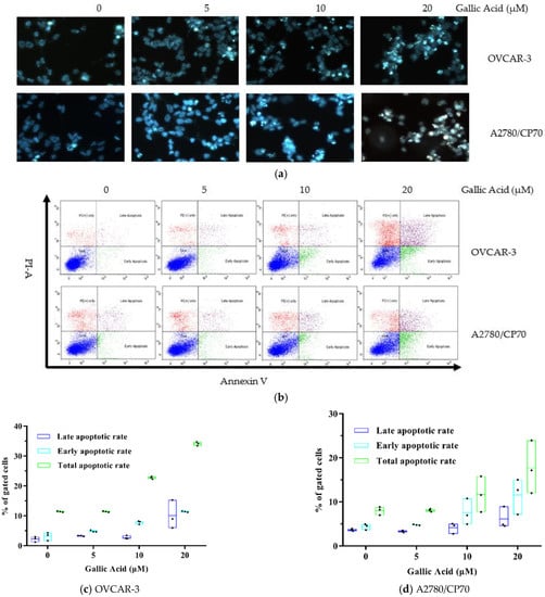 To explore GA-mediated inhibition of OC cell viability via cell apoptosis, we exposed both OC cells lines to GA treatment (0, 5, 10, 20 μM) for 48 h and assessed nuclear morphology alterations using Hoechst 33342 DNA staining. We demonstrated marked chromatin condensation and nucleus shrinkage with GA exposure in both OC cell lines (Figure 2a). To further confirm these results, we performed flow cytometry assays via Annexin V/PI staining. Based on our results, GA exposure markedly elevated apoptotic cell population in both OC cell lines and it was dose dependent (Figure 2b). The total apoptotic rate rose to 21.42% with 20 μM GA in OVCAR-3 cells vs. 5.34% in control cells (Figure 2c) (p < 0.01). Moreover, relative to controls, the early and late apoptotic rates of the OVCAR-3 cell line, with 20 μM GA exposure, were also significantly high at 11.36% and 10.06% (p < 0.01) respectively. As with the viability results, the suppressive role of GA on A2780/CP70 cells was lower than on OVCAR-3 cells. Similarly, GA exposure also induced less apoptosis on A2780/CP70 cells than OVCAR-3 cells. The total apoptotic rate rose to 17.69% with 20 μM GA exposure in A2780/CP70 cells vs. 8.01% in control cells (Figure 2d) (p < 0.01). From Figure 2b, the fraction of dead but non-apoptotic (PI+ only) cells also increase in a dose-dependent manner for OVCAR-3 cells. This indicates some non-apoptotic effects induced by GA on OVCAR-3 cells. It is reported that Rhein derivative 4a RHA also causes non-apoptotic effects on ovarian cancer cells by endoplasmic reticulum stress []. The non-apoptotic mechanism induced by GA on OVCAR-3 cells is still unclear, and further research is needed.