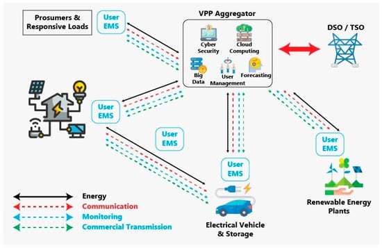 The controllability and visibility of DERs have been limited to the consumers as they need to be connected through the internet [2]. Now, with the VPP concept, all the DERs are controllable and viable to a wide range of customers, ranging from small to medium renewable sources in the electricity market. The schematic diagram of the VPP is shown in Figure 1.