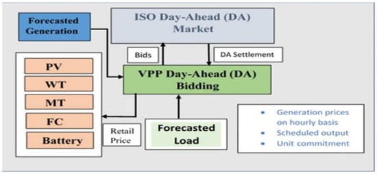 An optimal day-ahead schedule was developed using a modified scenario-based decision-making method for thermal and electrical energy sources. The uncertainties of intermittent renewable power generation, electrical demand and the market prices were also considered [16]. Optimal scheduling of DERs was presented for a VPP in many studies [17,18,19,20,21]. All of these contribute to solving the prevailing problem of integration of renewable energy sources along with the cost optimization of the VPP.
