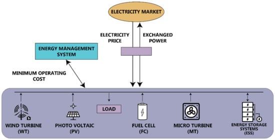 A case study is shown in Figure 3 to reveal the optimal dispatch strategy of the VPP with the grid. It consists of a PV system, wind turbine, fuel cell, micro-turbine and battery energy storage system, which represents the power trading with the grid and electricity market. The control strategies used in the VPP can be categorized into three types such as direct control, distributed control and hierarchical control. The direct control method is based on centralized control where decisions concerning VPP control are made in a centralized way. In the distributed control method, the decisions for VPP control are made in a fully decentralized way, and in the hierarchical control method, which is also the intermediary between direct and distributed control, decisions are made with some extent of the decision-making ability of the VPP. In this paper, the direct control strategy is used for the optimal co-ordination of DERs and to represent them as a single unit for the market, DSOs and TSOs. The VPP control center will take the request from individual VPP units based on the limitations and preferences of the owner [54].