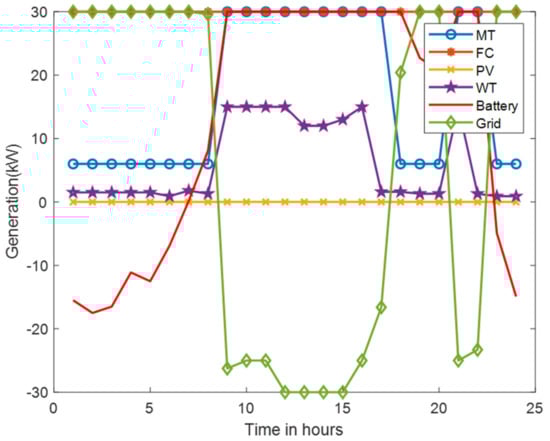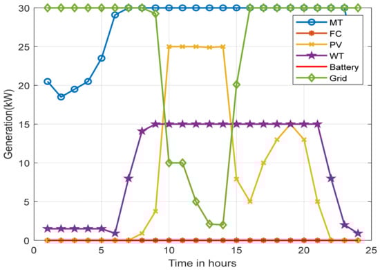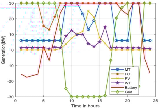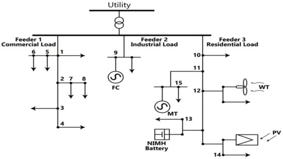 The test system consists of various RESs such as a PV, WT, MT, FC and battery storage system. The single line diagram of the test system is shown in Figure 5. All DG units are assumed to produce only active power at unity p.f. and are to be operated only in electricity mode. The data of the load demand, forecasted generation, maintenance cost, start-up/shut-down cost and market prices are taken from Mohammed Javad Kasaei [44]. The system includes an industrial feeder for supplying the workshop, a commercial feeder for supplying the small office and a residential feeder. A total load of 1695 kW is considered in the literature review for 24 h [44,49], but in this paper, the scheduling is developed only for the commercial loads considered. The optimal scheduling is developed for the test system with the day-ahead market strategy. Three different scenarios are considered for a more detailed explanation of the test system. It is assumed in the first scenario that all the units are in the ON condition and act within their power limitation. In the second scenario, the PV is assumed to be in the OFF condition. The other generations are within their limits. In the third scenario, the MT and FC are assumed to be in the OFF condition. The other generators are working within their limits and the exchange of energy with the utility is also considered in a constrained manner.