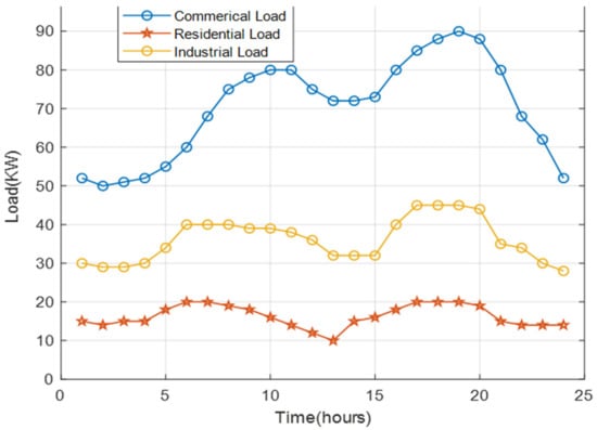 The hourly load curves for commercial, residential and industrial loads are available and are integrated into the VPP dispatch model. The load curves for the three types of load are shown in Figure 7.