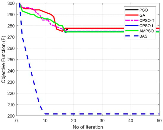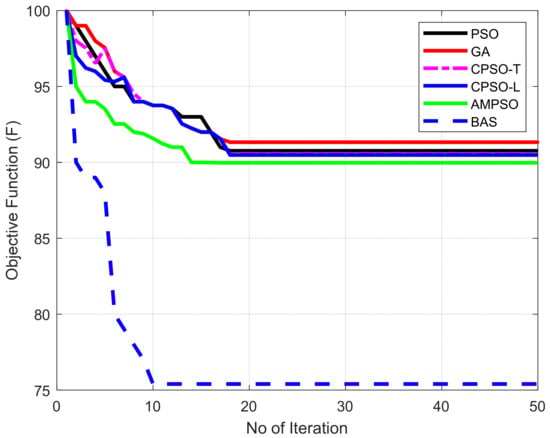 Comparison of the convergence characteristic of the objective function with different algorithms