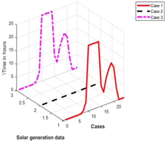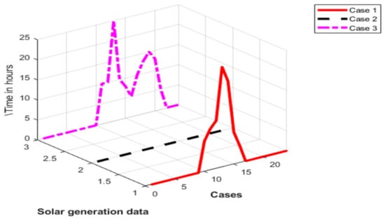The uncertainties due to the renewable energy sources affect the system security as it makes the gap between generation and demand. Therefore, in this paper, the beta distribution method is used for modeling the uncertainties of solar and wind generation [48,49]. The solar generation data with respect to time and different scenarios are shown in Figure 15. The solar generation data considering uncertainties for three different scenarios are shown in Figure 16.