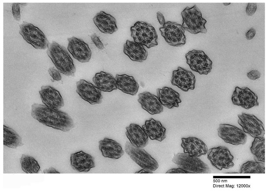 There is a bridge-like structure interconnecting the central pair of microtubules C1 and C2. The bridge-like design and the central pair of microtubules constitute the main sheath or central pair complex (CPC). The composition of each outer doublet is critical, and there are type A and B microtubules connected by radial spokes (RS) to the CPC. The motility relies on the inner dynein arm’s interaction (IDA) and outer dynein arm (ODA). They are carried by the A-type tubule and develop toward the B-microtubule of the adjacent doublet. IDA and ODA form part of a specific protein complex of 96 nm repeat unit. It includes four identical ODAs, six single-headed IDAs, one two-headed IDA, the three Rs, and a single nexin–dynein regulatory complex (N-DRC). The activity of the dynein arms is regulated and coordinated by the N-DRC. In the sperm flagellum, which has an ultrastructurally similar axonemal structure, accessory structures are also recognized. They include the mitochondrial sheath (MS), fibrous sheath (FS), and outer dense fibers (ODFs) [4]. This anatomy is specific to the sperm tail. They are needed for fertile sperm production and critical for the movement of the sperm in the female reproductive tract. Their central doublet must orientate neighboring cilia to beat in a coordinated way in a parallel fashion. Such ciliary beating coordination may be assessed by measuring the standard deviation of the angles formed between the central microtubules of neighboring cilia with the x-axis [5,6].