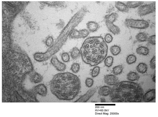 This architecture gives the classical 9 + 2 microtubular arrangement often searched for in patients harboring a cilia’s potential defect (Figure 1). In examining the ciliary ultrastructure, the diagram of a transverse section of a normal cilium depicts the internal ultrastructure and the ciliary axis used to identify cilia orientation concerning each other. A ciliary membrane typically surrounds the axoneme (central core). It has nine peripheral microtubule doublets and two single central microtubules (Figure 1). The ultrastructural analysis is, however, challenging and needs to be carried out in several sections. Often some parts may be in focus.