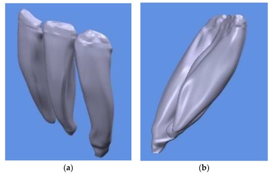 The model obtained for three teeth: (a) facial aspect (from left to right—the central incisor, the lateral incisor and the canine); (b) lingual aspect (from left to right—the central incisor, the lateral incisor and the canine).