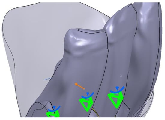 A uniformly distributed force was applied to each tooth. The Distributed force tool was used. This force was applied to the midpoint of the buccal surface of the tooth crown, as shown in Figure 8.