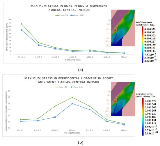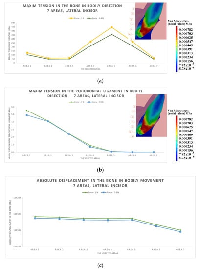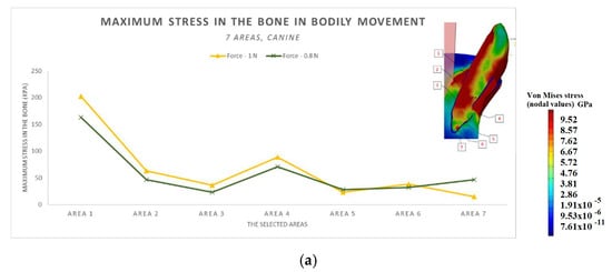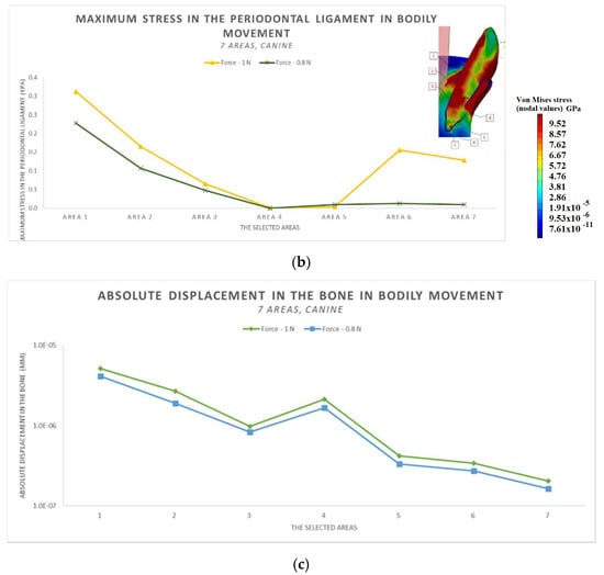 In area 5–6, the PDL was very thin, almost non-existent, and the displacement was accelerated by the decreased thickness of the PD. From area 1 to area 5, the appearance of a relatively horizontal curve confirmed that bodily displacement was obtained in this situation. Areas 6 and 7 exhibited lower displacement due to the fact that the apex was fixed to the periodontium. Otherwise, the two curves were similar: as the force increased, an increase in displacement was observed (Figure 9c). Therefore, when the force was increased from 0.8 to 1 N, the stress in the bone increased significantly compared to the values in the ligament; the two lines had a similar appearance for 0.8 N and 1 N. Therefore, stress levels increased in areas 4, 5 and 6, where the PDL was thinning, with a peak in zone 5, where the PDL was greatly diminished and it was not fully functional, and where the PDL was greatly diminished and it was partially functional. In area 7, its value returned to the tendency of the curve.