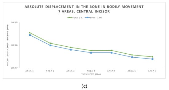 Observing the amplitude of the displacement for each area, the greatest displacement was found in area 1 and the lowest in area 7. Thus, this was bodily displacement with tipping. These two curves had an identical appearance, without any change after an increase in force from 0.8 to 1 N (Figure 10c).