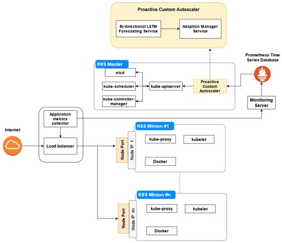 - First, a bidirectional long short-term memory (Bi-LSTM)-based [20] proactive autoscaling system architecture designed for Kubernetes is proposed, and it is shown that the proposed autoscaling system achieves a higher accuracy in resource estimation than the default horizontal pod autoscaler of Kubernetes.