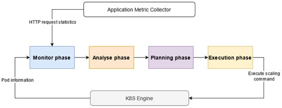 In this phase, the monitoring server, described in Section 3, continuously receives different types of data for analysis and planning phases to determine appropriate scaling actions. In this paper, the different types of data are collected from two sources: (1) the networking data of the load balancer, such as number of HTTP requests per second through the application metric collector, and (2) pod information of all running nodes such as the number of pod replicas, which are retrieved from the master node (using kube-apiserver).