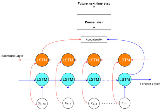 The regular RNN or LSTM traverses input sequence with forward direction of the original time series. The Bi-LSTM [20] are an extension of the LSTM models with two LSTMs applied to the input data. The first LSTM is trained on the input sequence with its original direction (forward). The second LSTM is fed with the reverse form of the input sequence (backward). This architecture of Bi-LSTM is two LSTM networks stacked on top of each other. It bidirectionally runs the input from two directions, the first one from past to future, the second from future to past. The difference from forward LSTM is that running backward helps preserve information from the future. By combining two hidden states, one can preserve information from the past and the future. Applying the LSTM twice leads to improved learning long-term dependencies and thus consequently will improve the accuracy of the model [38].