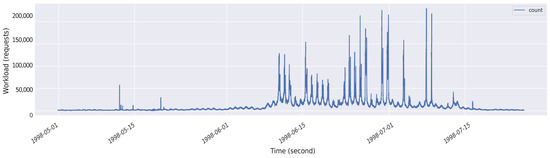 The NASA logs were collected by the NASA Kennedy Space Center WWW server in Florida for two months, and can be classified into two sub-logs [27]. The first log contains all HTTP requests made from 00:00:00 1 July 1995, to 23:59:59 31 July 1995 (total 31 days). The second log contains requests made from 00:00:00 1 August 1995, to 23:59:59 31 August 1995. These two logs contain 3,461,612 requests in total. Because of Hurricane Erin, the server was shut down, so there were no logs between 1 August 1995 14:52:01 and 3 August 1995 04:36:13. This dataset has been used in [15,41,42] and others to evaluate the autoscalers.