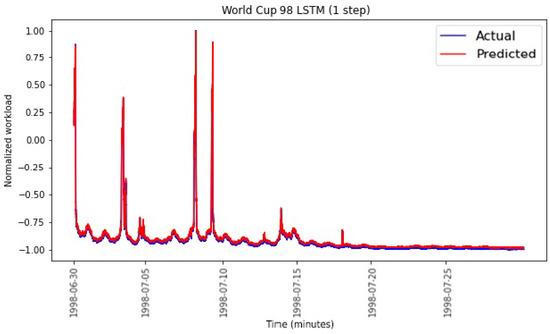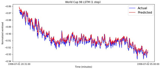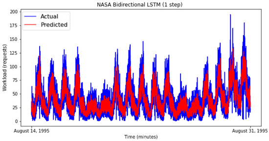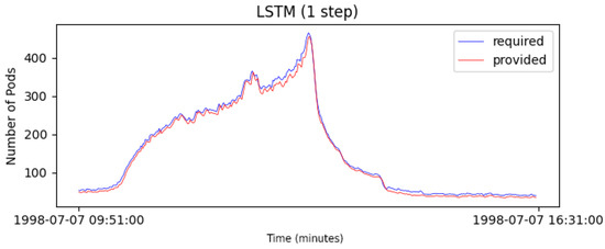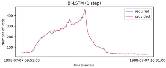 Because the ARIMA model exhibits a poor prediction speed, it is not suitable for real-time autoscaling systems and thus is not considered in this experiment. For this experiment, we took a testing subset of the NASA dataset from 7 July 1998 09:51:00 to 1 July 1998 16:31:00. Figure 16 and Figure 17 show the number of pods produced by the LSTM and Bi-LSTM autoscalers for the one-step prediction. A comparison of both autoscalers is shown in Table 6, where Bi-LSTM achieves better performance in and in one-step and five-step predictions. These results show that the proposed Bi-LSTM autoscaler tends not to have over-provision, and when it does, it occurs for a shorter time as compared to LSTM. In contrast, the LSTM autoscaler achieves better performance in (both one-step and five-step predictions), and the of both autoscalers are almost equal in the one-step prediction. It is shown that LSTM tends not to have under-provision as compared to Bi-LSTM. Finally, the Bi-LSTM autoscaler outperforms the LSTM autoscaler in elasticity speedup in both one-step and five-step predictions, which indicates that Bi-LSTM has a higher autoscaling gain over LSTM.