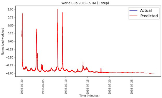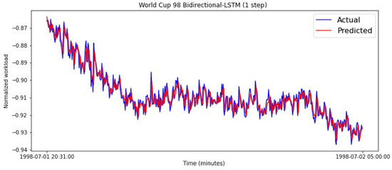Bi-LSTM with one-step prediction on the testing set (from 1 July 1998 20:31:00 to 2 July 1998 05:00:00).