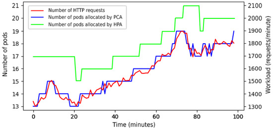 Figure 18 shows the changes in the number of pods of the proposed proactive custom autoscaler (PCA) and the HPA for the given workload in a real environment. By default, every 15 seconds, also known as the sync period, the HPA will compare the collected metric values against their predefined thresholds. In this experiment, the metric for the HPA is CPU usage, and its threshold is 70%. Once the average CPU usage exceeds the predefined threshold, the HPA will calculate and increase the number of pods in the cluster. There will be a delay time for creating new pods and assigning them to the nodes, which is the common drawback of the reactive approach. It only reacts to workload changes after it happens and spends a certain time reconfiguring the system to adapt to the new workload. In addition, the default value for down scaling is 5 minutes. This means that the HPA will keep monitoring the average CPU usage, and if its value is below the threshold for 5 min, HPA will start scaling down. This mechanism of HPA is called cooldown/delay [12]. It is shown in Figure 18 that the scaling down actions happen quite late, around the 20th and 83rd min, which leads to a waste of resources due to a slow response to traffic demand change. In contrast, the proactive custom autoscaler (PCA) has better performance in accuracy and speed than HPA because PCA can predict the trend of workload and perform the scaling up/down actions more accurately and ahead of time. Moreover, when the workload decreases, the PCA was found to remove a part of pod replicas, thus making it efficient when handling a burst of workload in the near future.