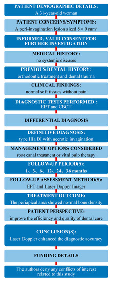 In this case report, a necrotic invagination was debrided and filled, and the viable main root canal was followed-up [20]. However, as other major lesions were present, other dental specialists were consulted. A more accurate pulp diagnosis was required for the treatment plan [21,22].