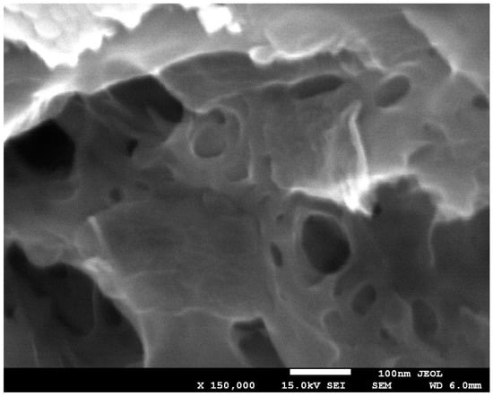The surfaces of the obtained nanocomposites have a vesicular structure, which may be due to the fact that during nanoparticle generation, the alginate formed as nanocapsules with a size of about 20–50 nm (Figure 2B,F). During the measurement, due to the electron beam passing through the sample, numerous cracks were formed on the surface of the film (Figure 2C,G), allowing for the observation of the internal structure of the film. Figure 3 clearly shows that the internal structure of the film is porous; the resulting nanopores are most likely due to the presence of graphene oxide [43].